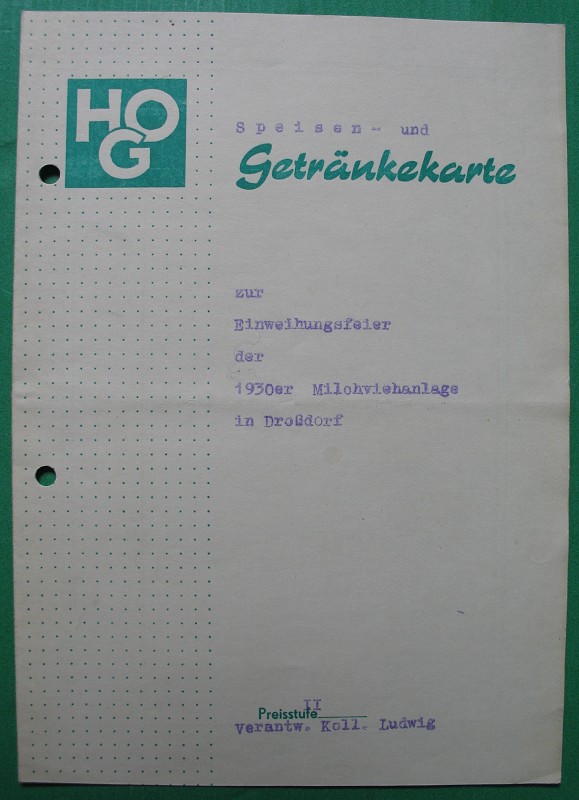 Einweihungsfeier 1930-er Milchviehanlage in Droßdorf, Speisenkarte DDR HO