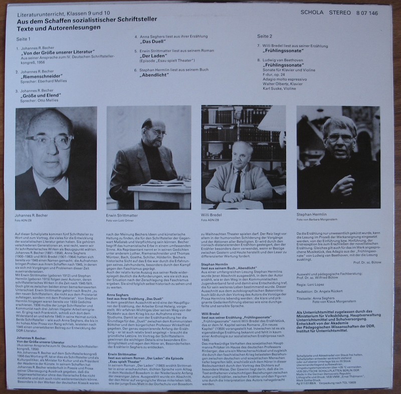 Johannes R. Becher, Erwin Strittmatter, Willi Bredel, Stephan Hermlin, Schallplatte Schola, DDR, 1989, nr455