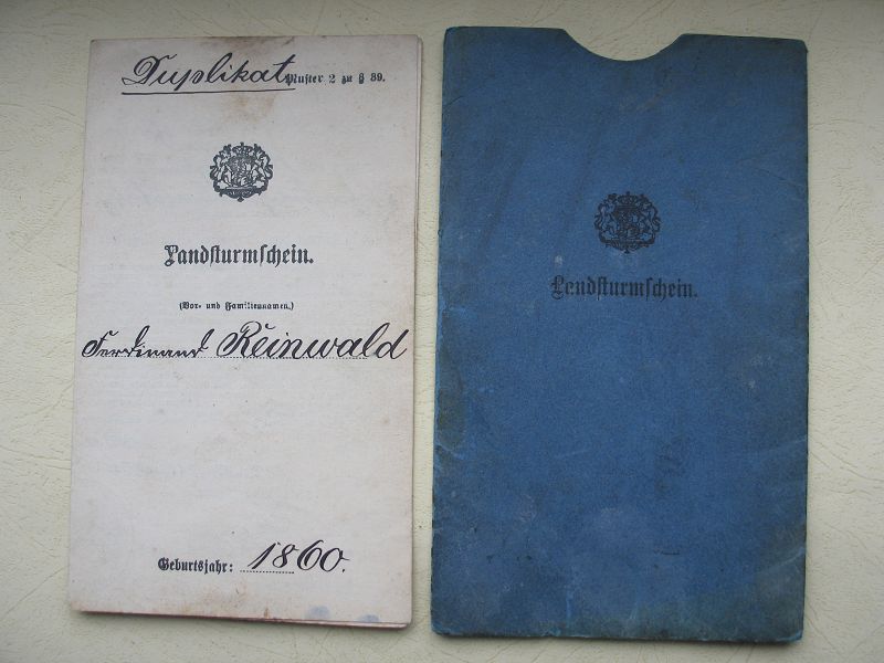 Hülle 9 x 15 cm, darin der Landsturmschein (1898 ausgestellt als Duplikat)