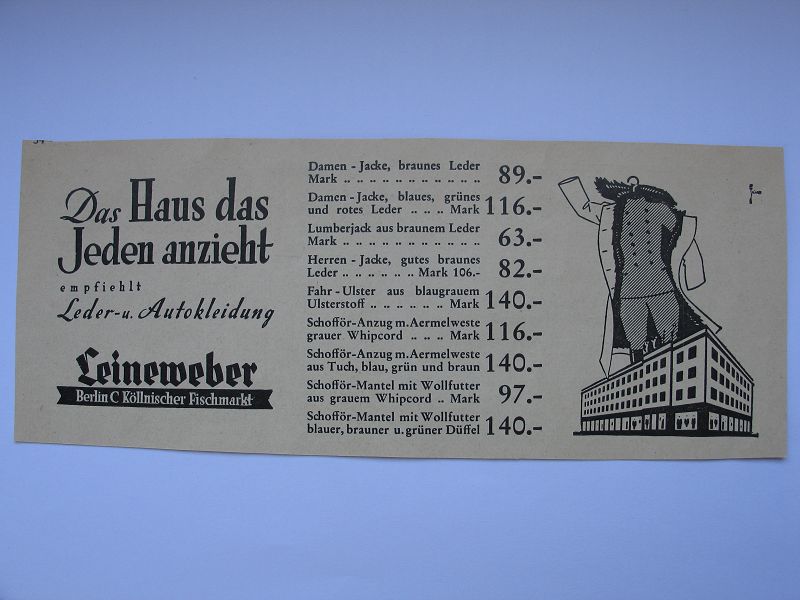 Leineweber Berlin, Leder- u. Autokleidung, Inserat 1929 #1