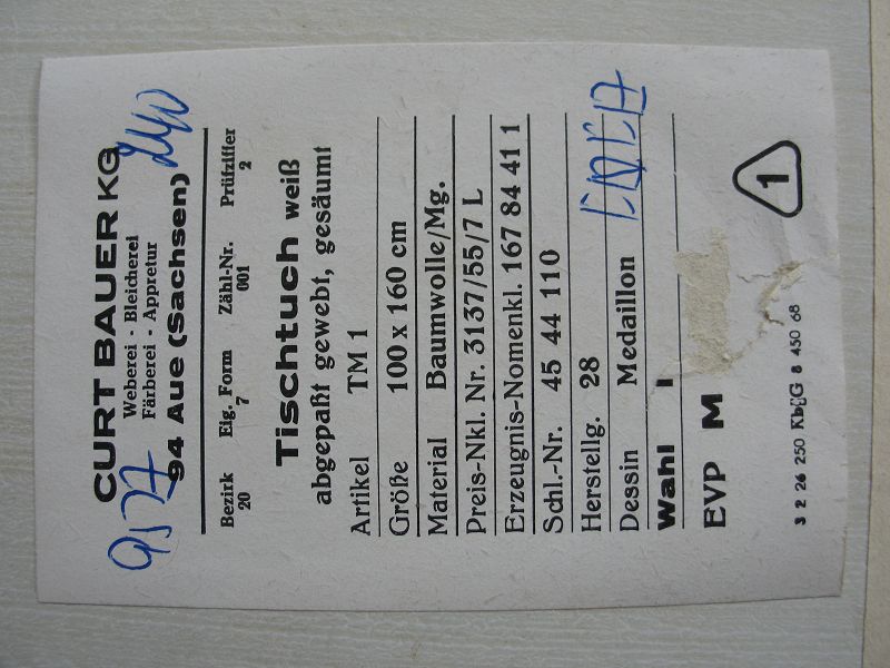 Unbenutzte Tischdecke, Tischtuch von der Curt Bauer KG Aue in Sachsen,